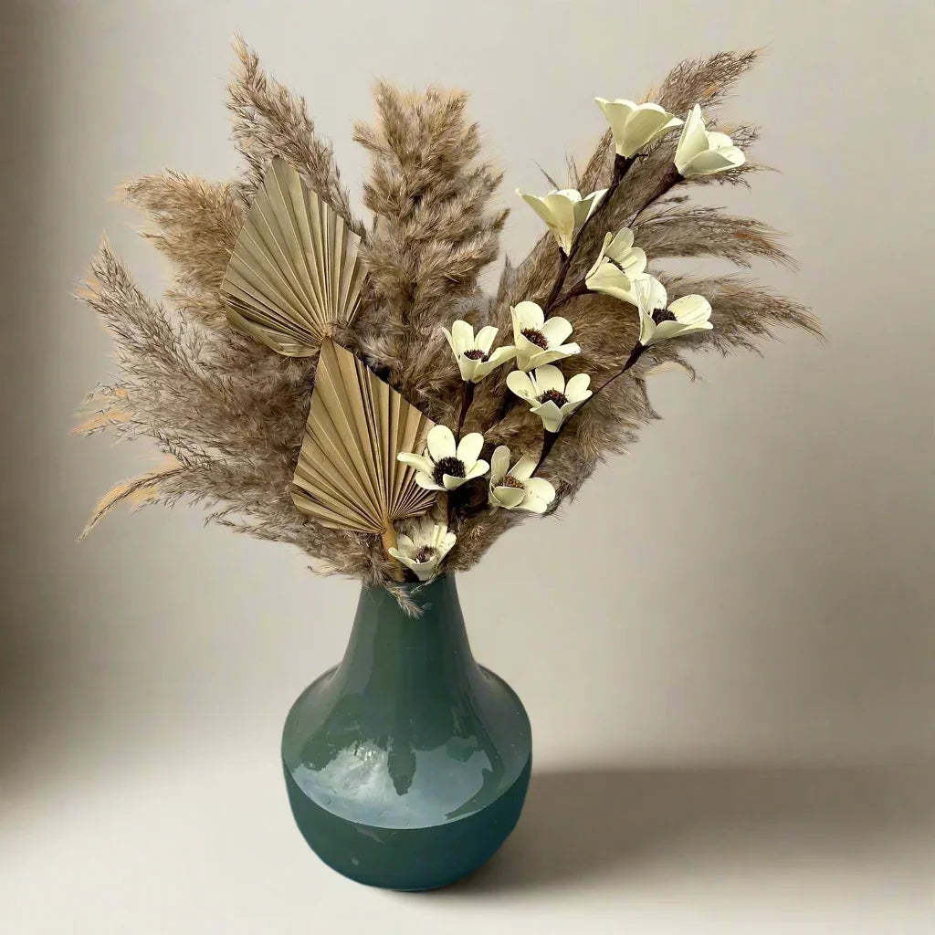 This Boho Garden Bunch in mirage metal vase is a perfect accent for any space. The bohemian feel of this bunch with handmade white flowers and palm spear can make any space look stunning.