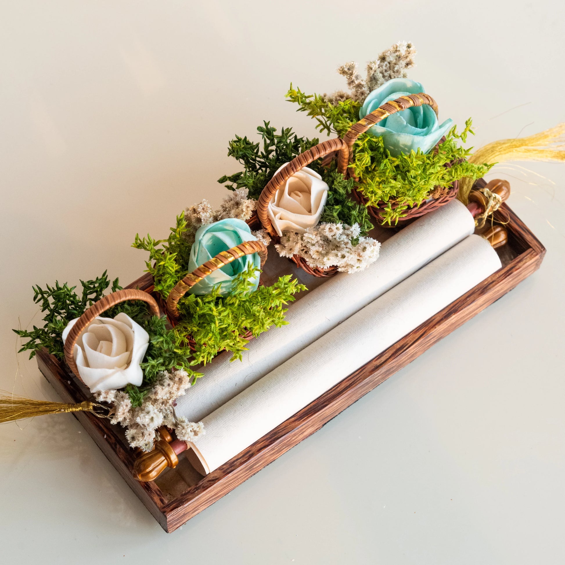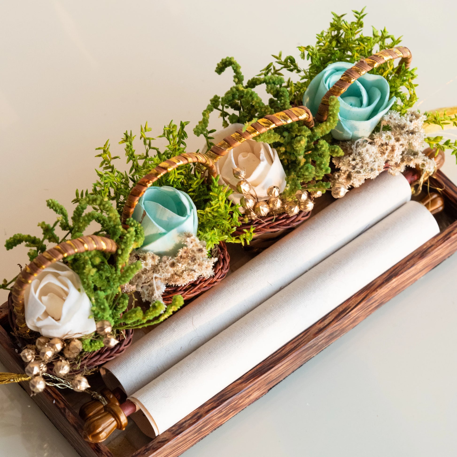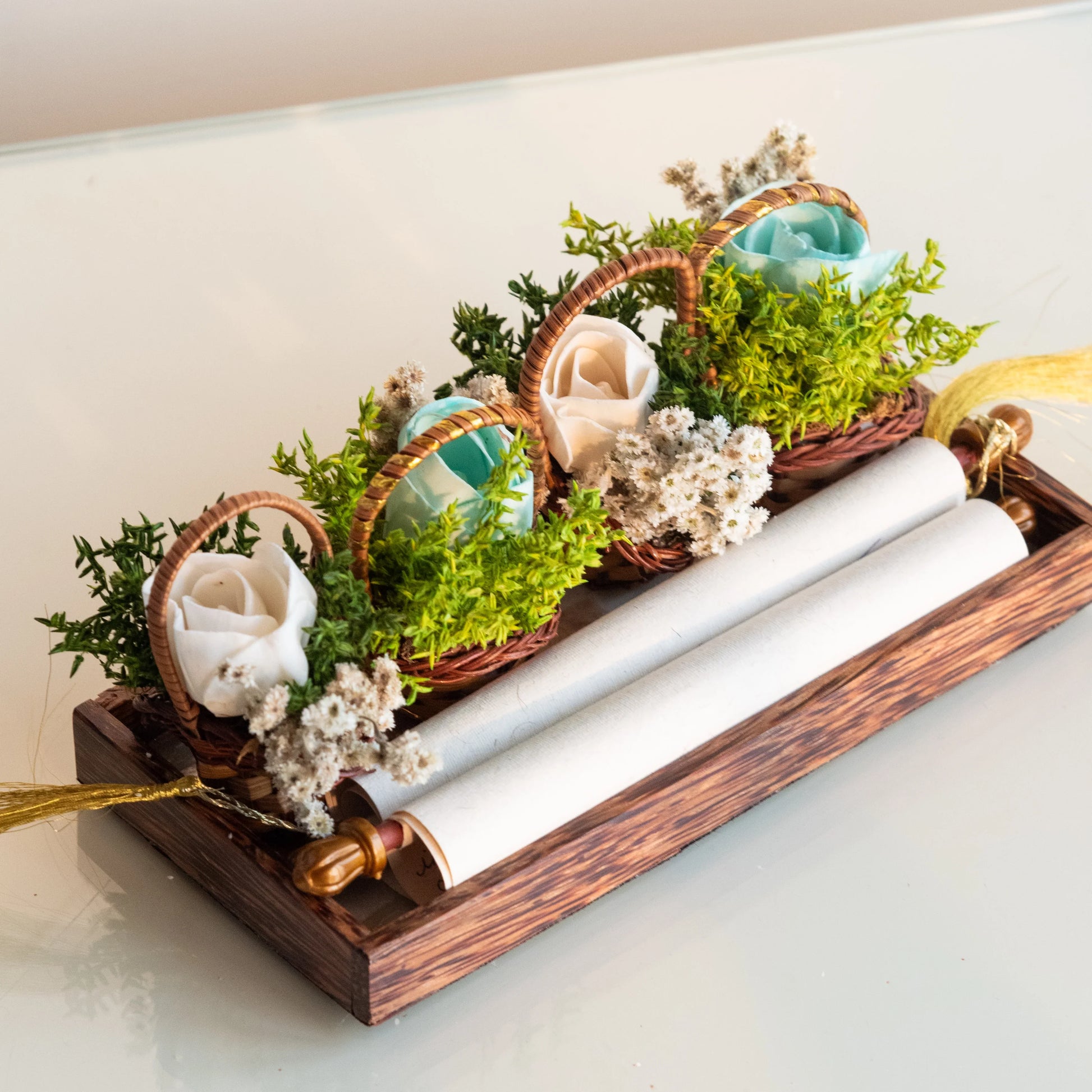 The set includes 3 Blue baskets and 3 White Baskets. Get this super cute limited edition floral mini baskets. Use these baskets to decorate trays or to keep it in a small shelf space or in your DIY arrangements