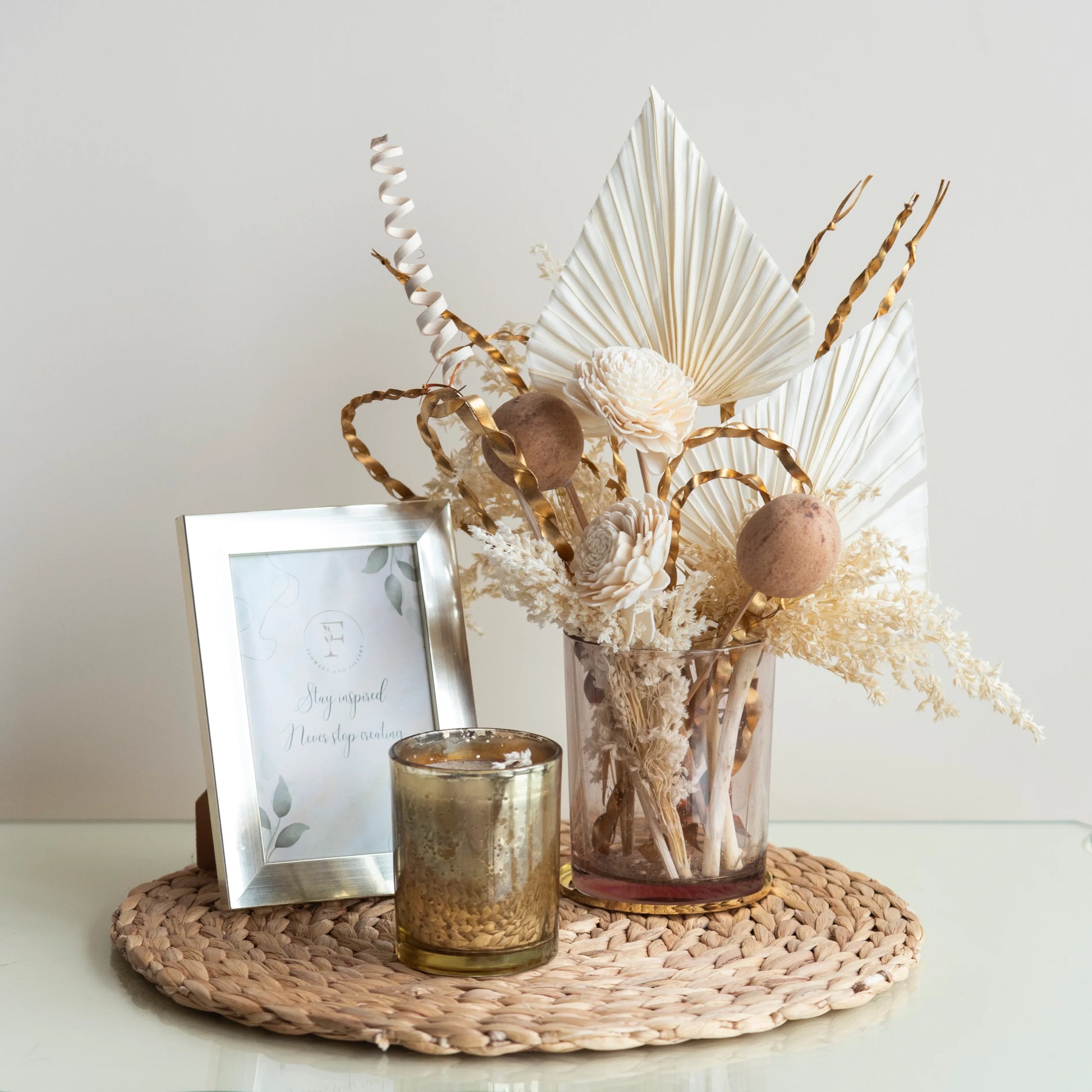 This beautiful Sun-Kissed Bunch is a perfect accent for any coffee table. The muted colors of this bunch with a touch of golden filler can make any space look Boho and vibrant.