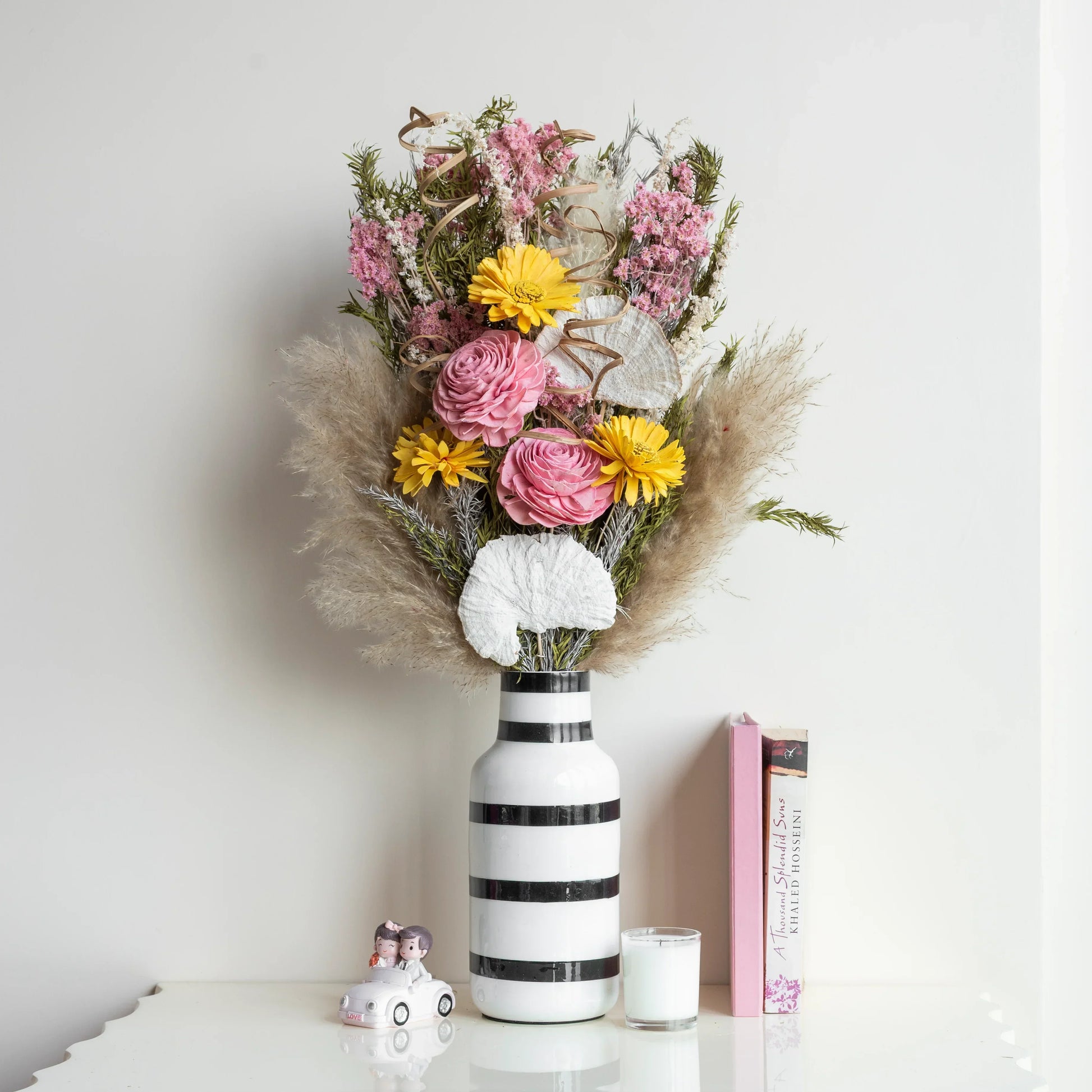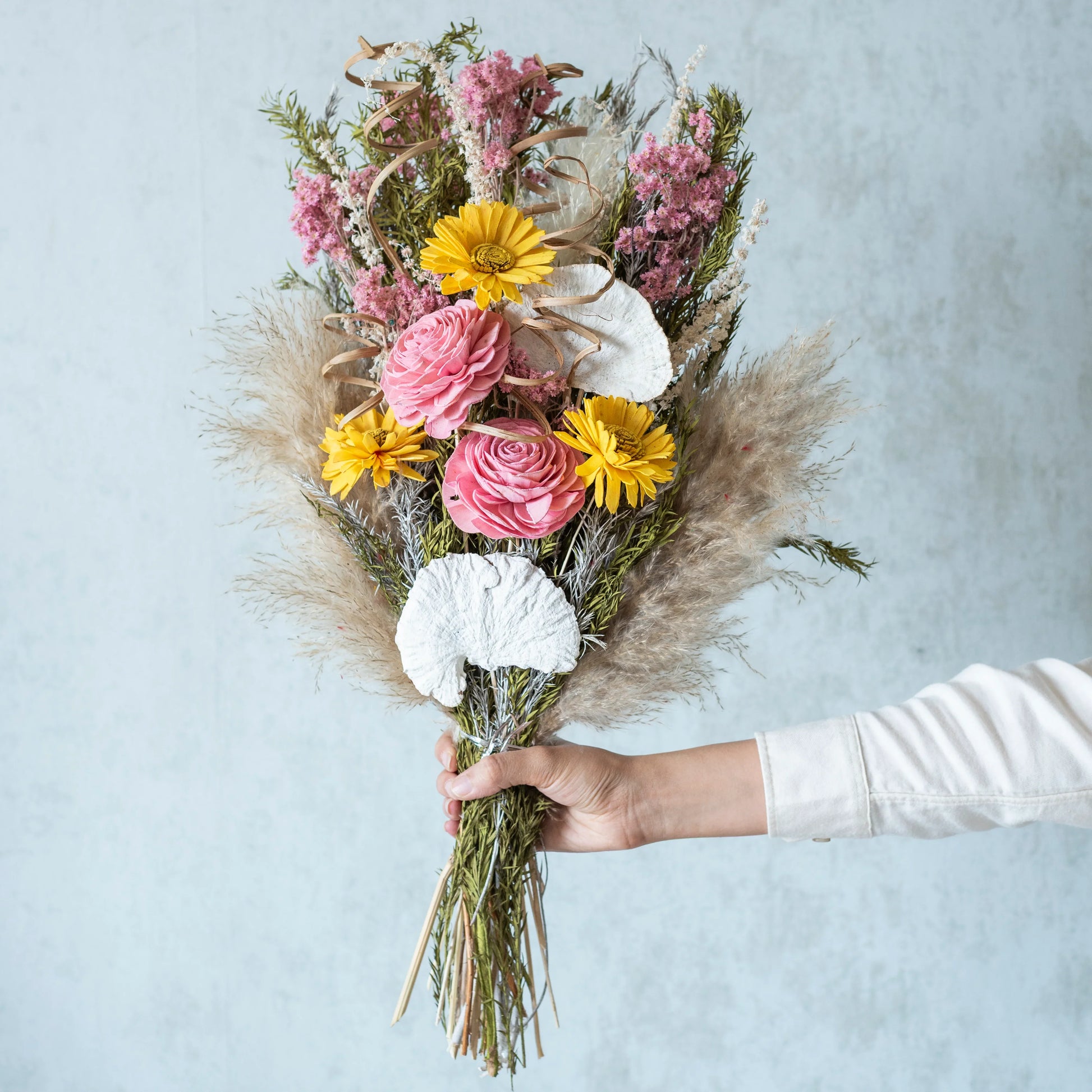 Bold, bright, and full of personality — the Sun & Blush Bunch is designed to bring joy to any corner of your home. Featuring sunshine-yellow daisies, soft pink sola wood flowers, natural pampas plumes, and textured botanical accents, this arrangement is a perfect blend of elegance and energy.