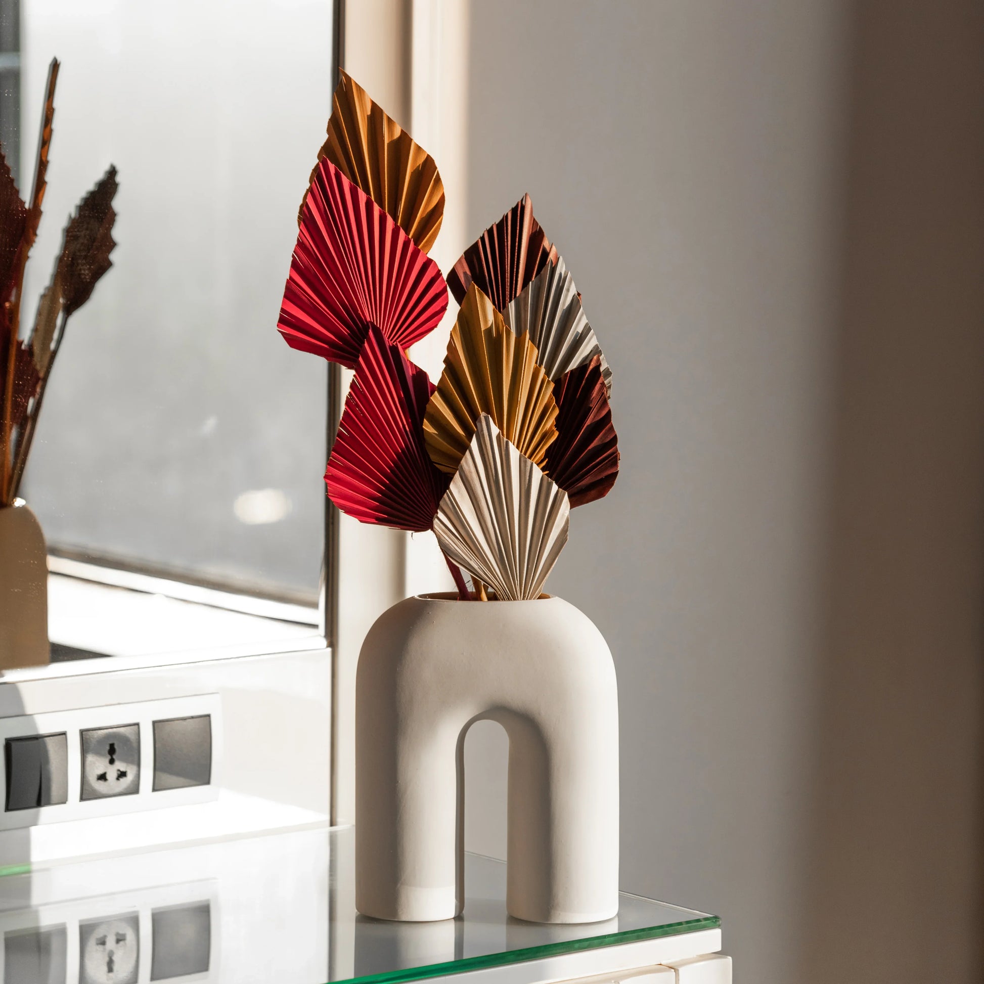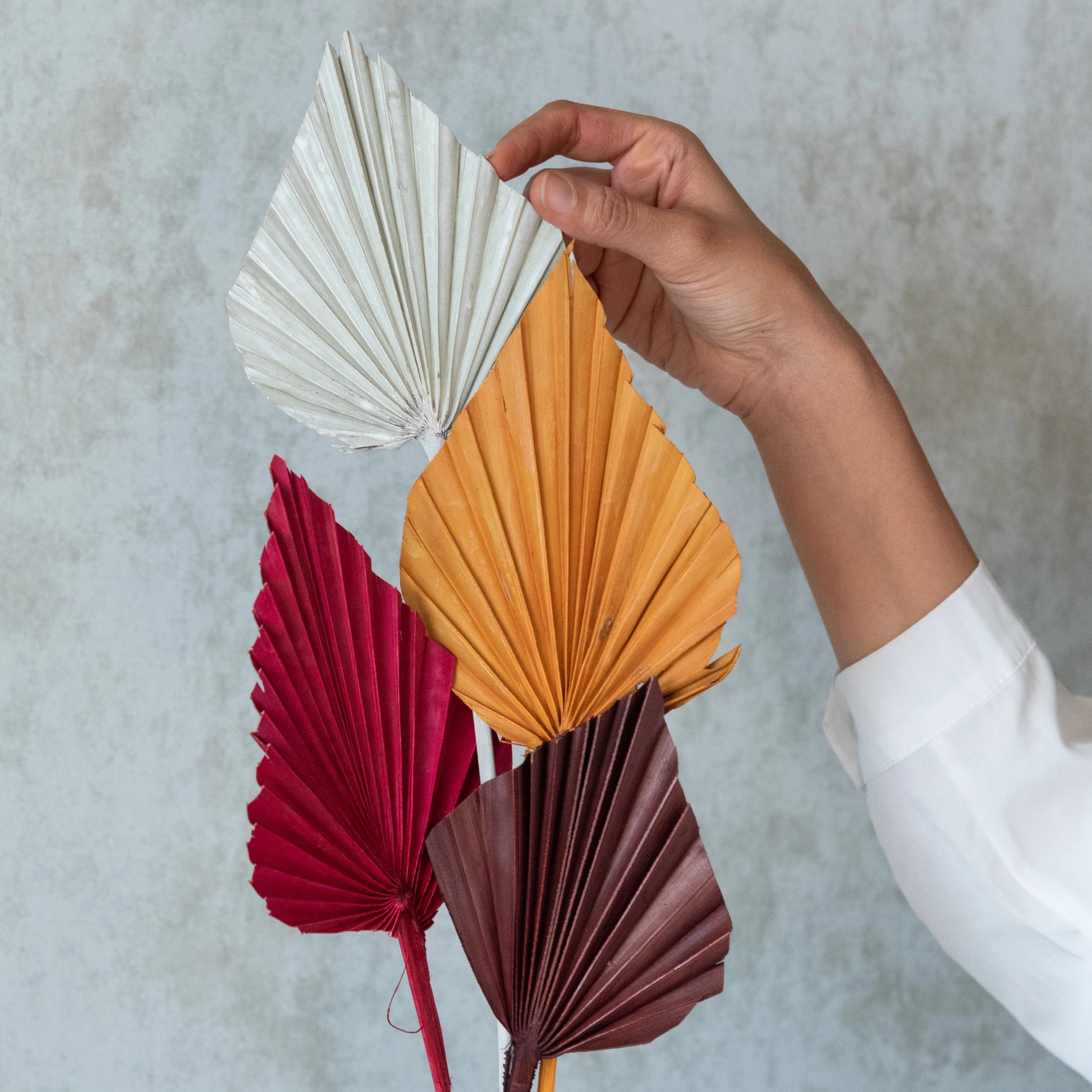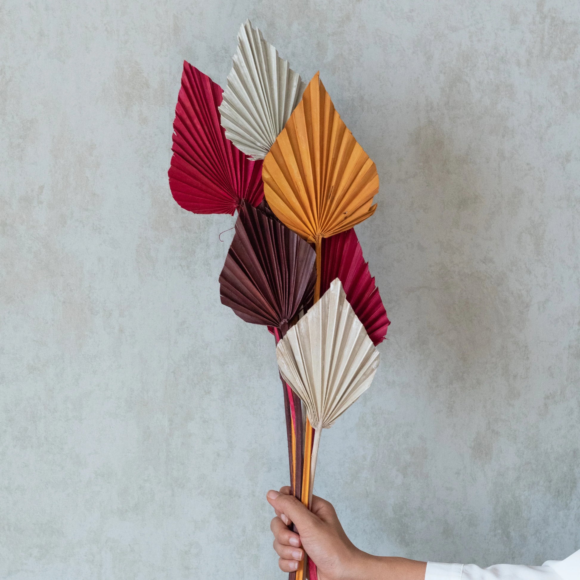 These sunset woody colors are the most eye pleasing way to fill your vase. The combination includes 2 Mustard, 2 Red, 2 Whitish grey and 2 brown palm leaves.