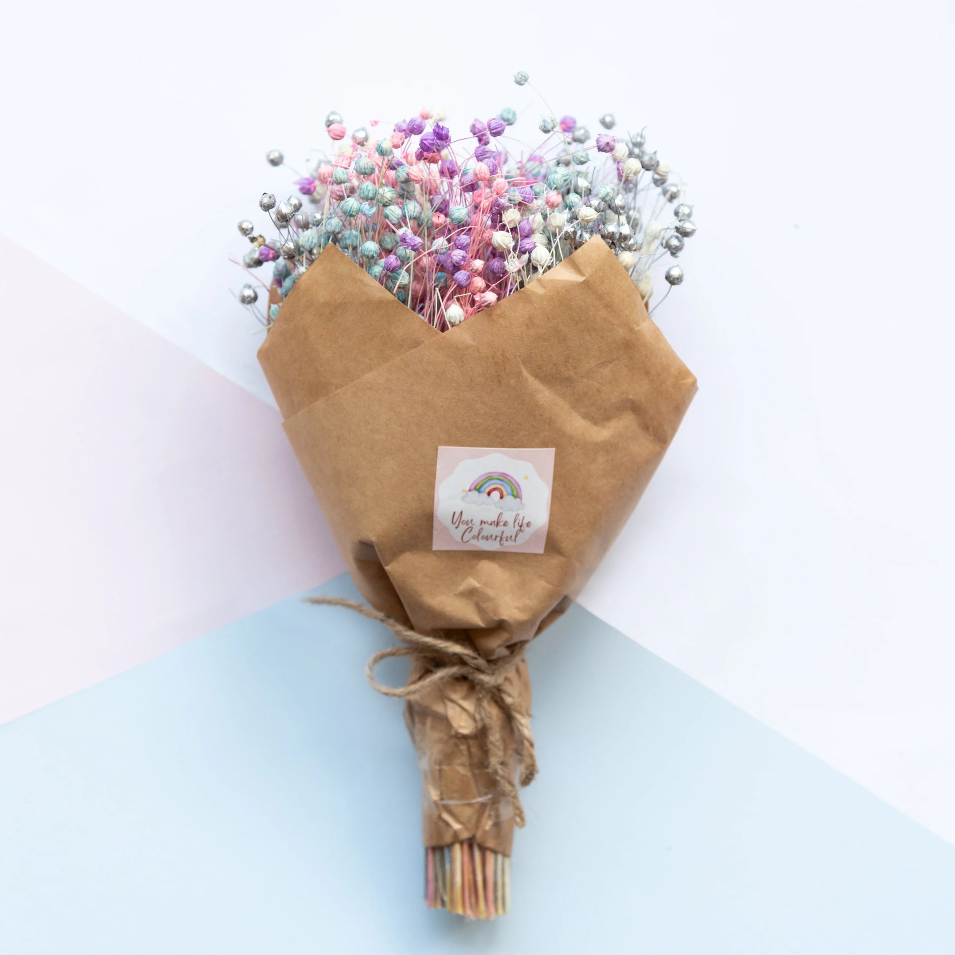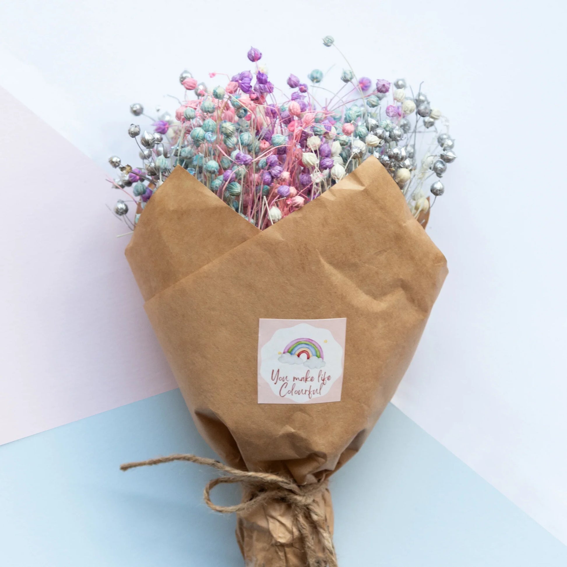 Presenting our "Unicorn Bouquet", a delightful ensemble of lino grass in a spectrum of colors that will surely make your heart flutter. Wrapped in eco-friendly brown paper and adorned with a special tag that reads "You make my life colorful," this bouquet is a unique and thoughtful way to express your affection.