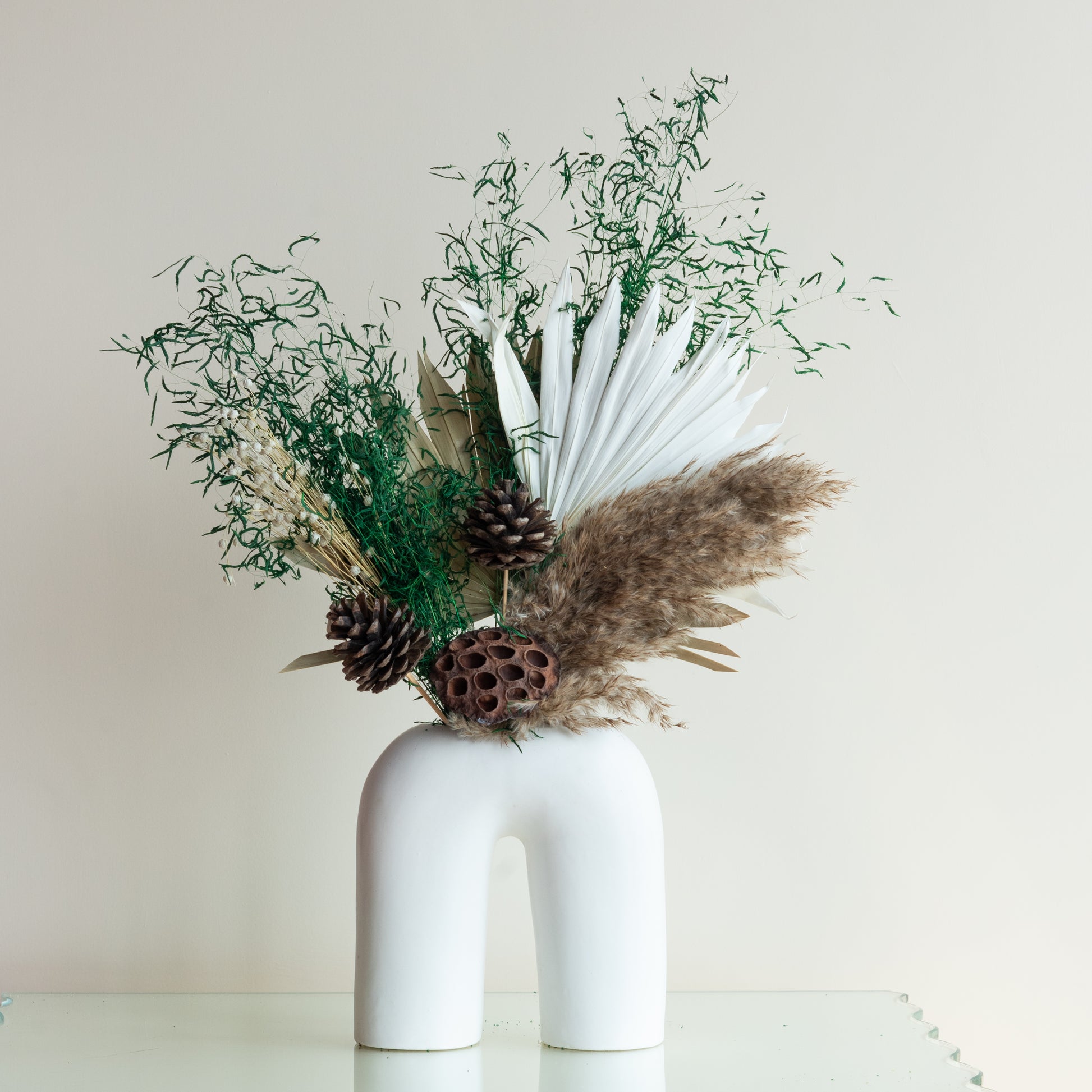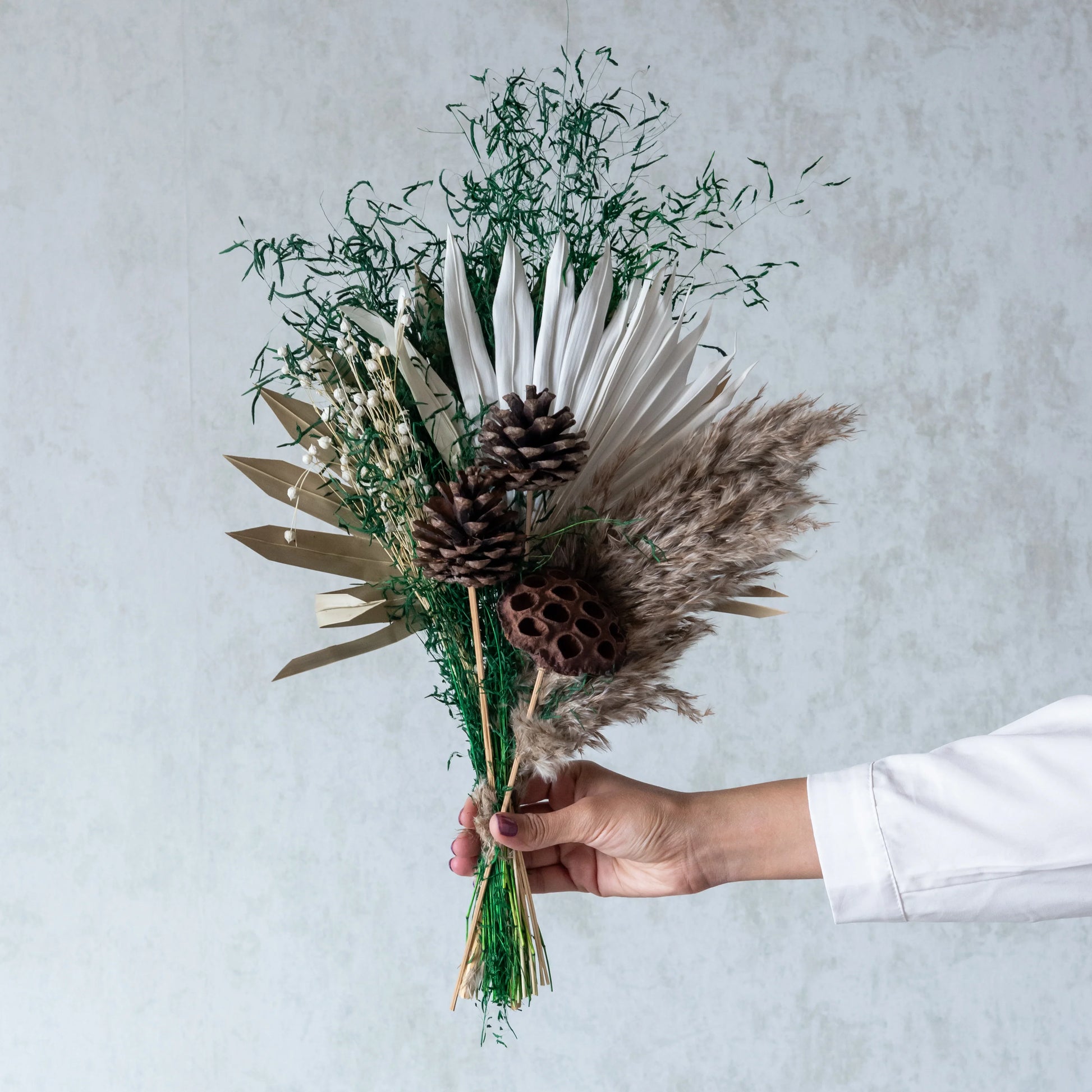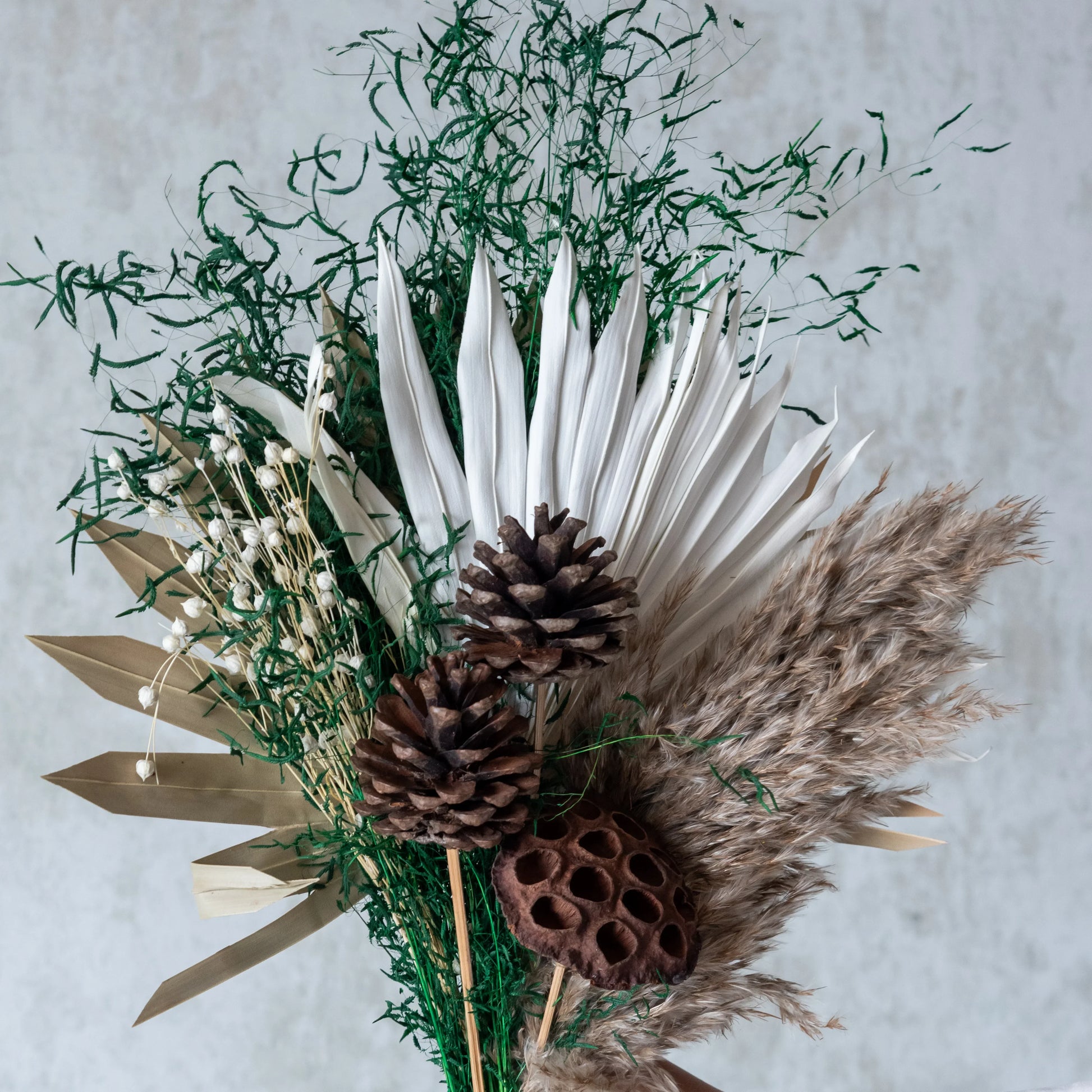 This Wild Forest bunch is the most exotic accent for any space. The white and green color of this bunch with a touch of White filler , pampas and palm leaves can make any space look stunning.