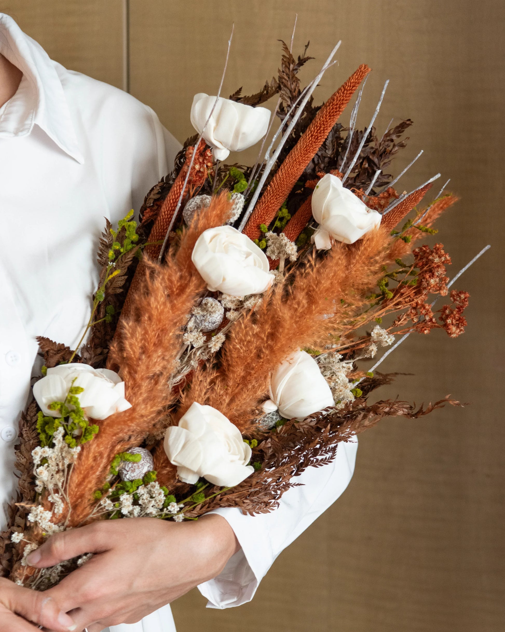This Wildwood Bunch is a perfect accent for any space. The rustic colours of this bunch with a touch of green filler and handmade white sola flowers can make any space look stunning.